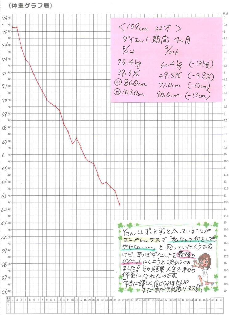 「病院通いの私でもダイエットに成功!お医者さんにもびっくりされました。薬の量もどんどん減りました。」